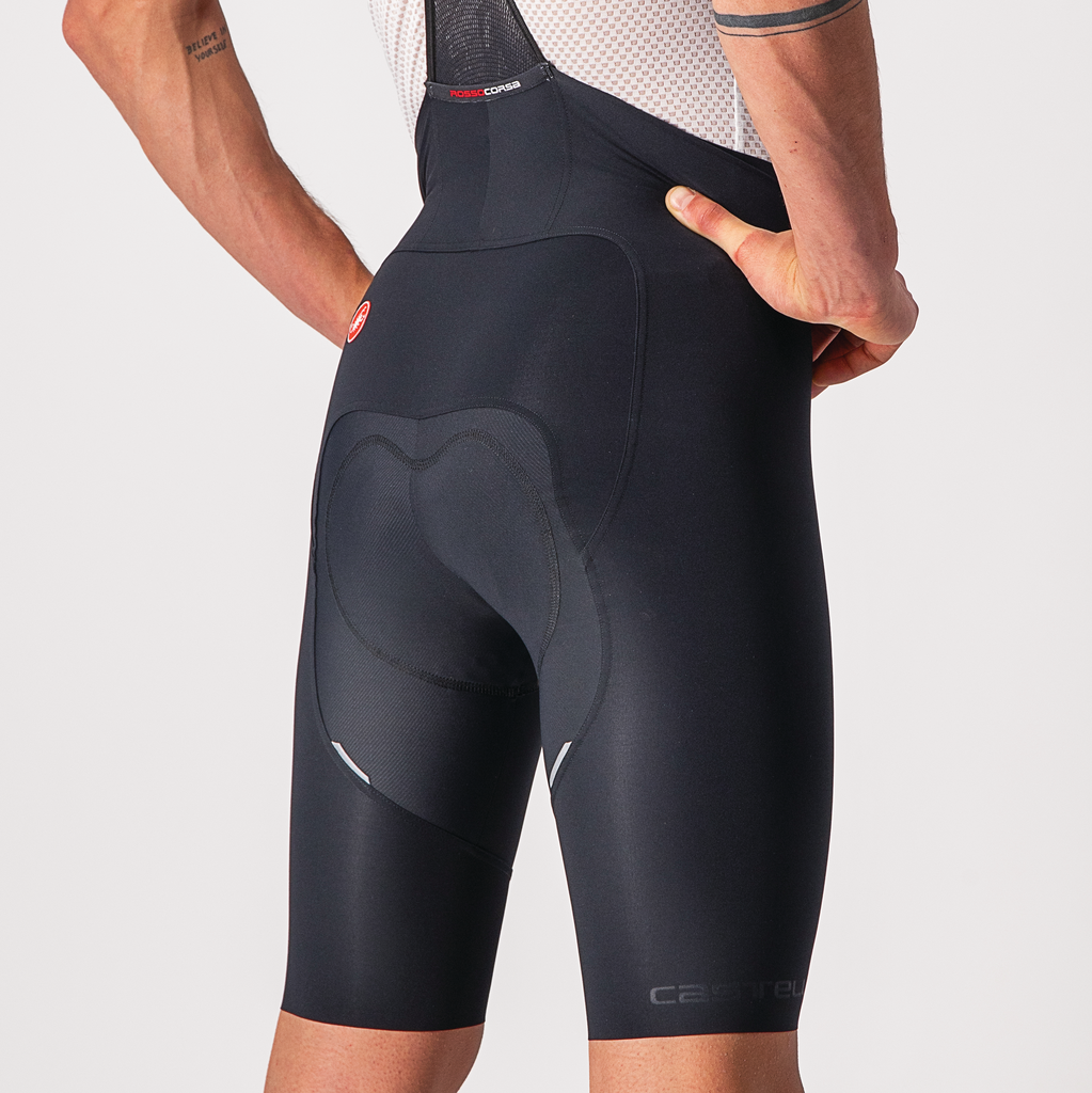 INNOVATIVE EVOLUTION The Free Aero RC Bibshort is our top race short, which also means that it's insanely comfortable even if you never pin on a number. It's fair to say that we've been working on this short for the past 15 years. That's how long it's been since the original Free Aero Race Bibshort was first introduced, initially as our top-of-the-line race short. Since then it has won three Tours de France, three Giro d'Italia, one Vuelta and San Remo, but it also became the best-selling product in the history of Castelli because, simply put, this is the short that does everything well. The concept is quite simple: start with the best pad we know how to make, surround it with a supportive short with good muscle compression, and then remove everything else that's not absolutely necessary. You feel Free thanks to the reduced number of panels and the reduced number of seams. In fact, the short portion has just 5 panels compared to 10 in the previous generation. You feel Free because of further refinements to the Progetto X2 Air seamless seat pad. The two densities of foam plus the gel pads provide progressive damping, while the separate Skin Care Layer is soft and stretchy to move with your skin. You feel Free thanks to the most minimal bibs you've ever seen in a short, including open-weave straps for maximum airflow. But we reinforced the yoke so the straps stay in place and made the mesh back narrow for coverage that is minimal yet just enough to hold the shorts in place. And the bib elegantly frames a convenient pocket at the centre back. You feel Free because this is the first high-end short that doesn't need any sort of gripper or elastic at the end of the leg to keep the leg in place. Getting this right meant 28 prototypes and our most extensive test program ever, and it results in the most comfortable leg ending we've ever made. The Forza 2 fabric has 32% Lycra® with a high modulus for exceptional muscle support and just the right amount of compression. There's reflective piping on the back. And all logos are either stitched or embossed for durability.