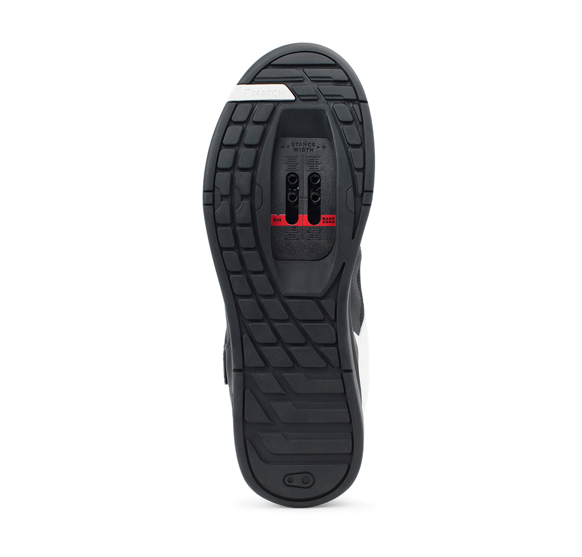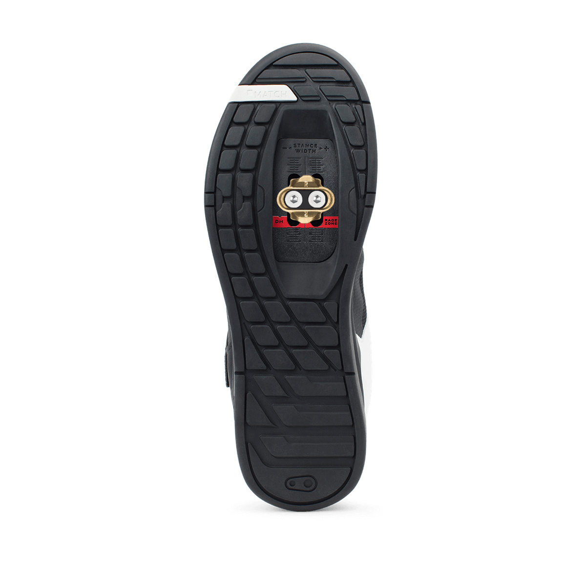 The ramped cleat box offers easy front and rear pedal entry and mud shedding. A Race Zone setback on the cleat track allows the cleat to be positioned further toward the heel for added control and stability when descending.