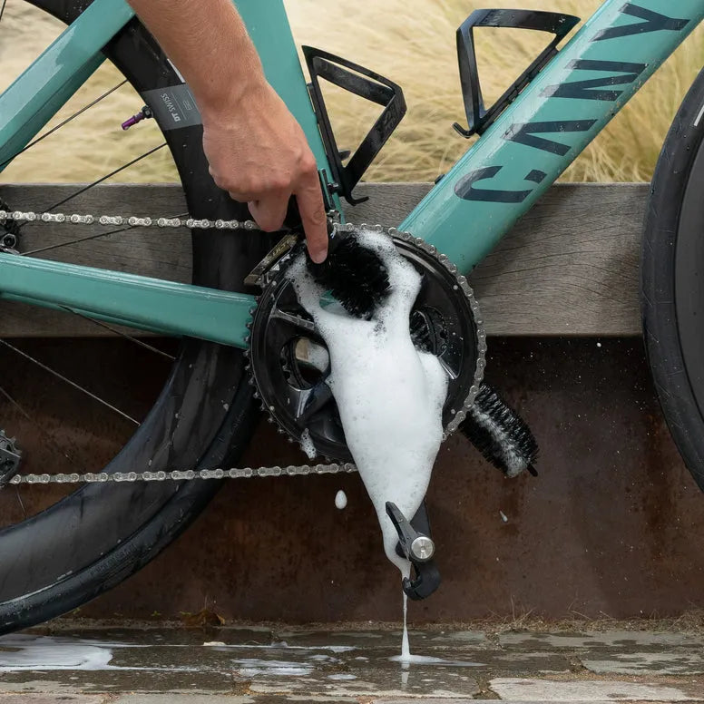 Fill a bucket with (warm) water and a foamy cleaner like Badass Bubbles. Make sure the So Long Brush is wet before you brush the dirt of your bike. Doing a quick wash? Cover your bike with Dirt Destroy and let it sit for around 2 to 3 minutes. Attack the tight areas with the So Long Brush. Then rinse with water or wipe dry with a clean, dry Microfibre Polishing Cloth or Turbo Towel.