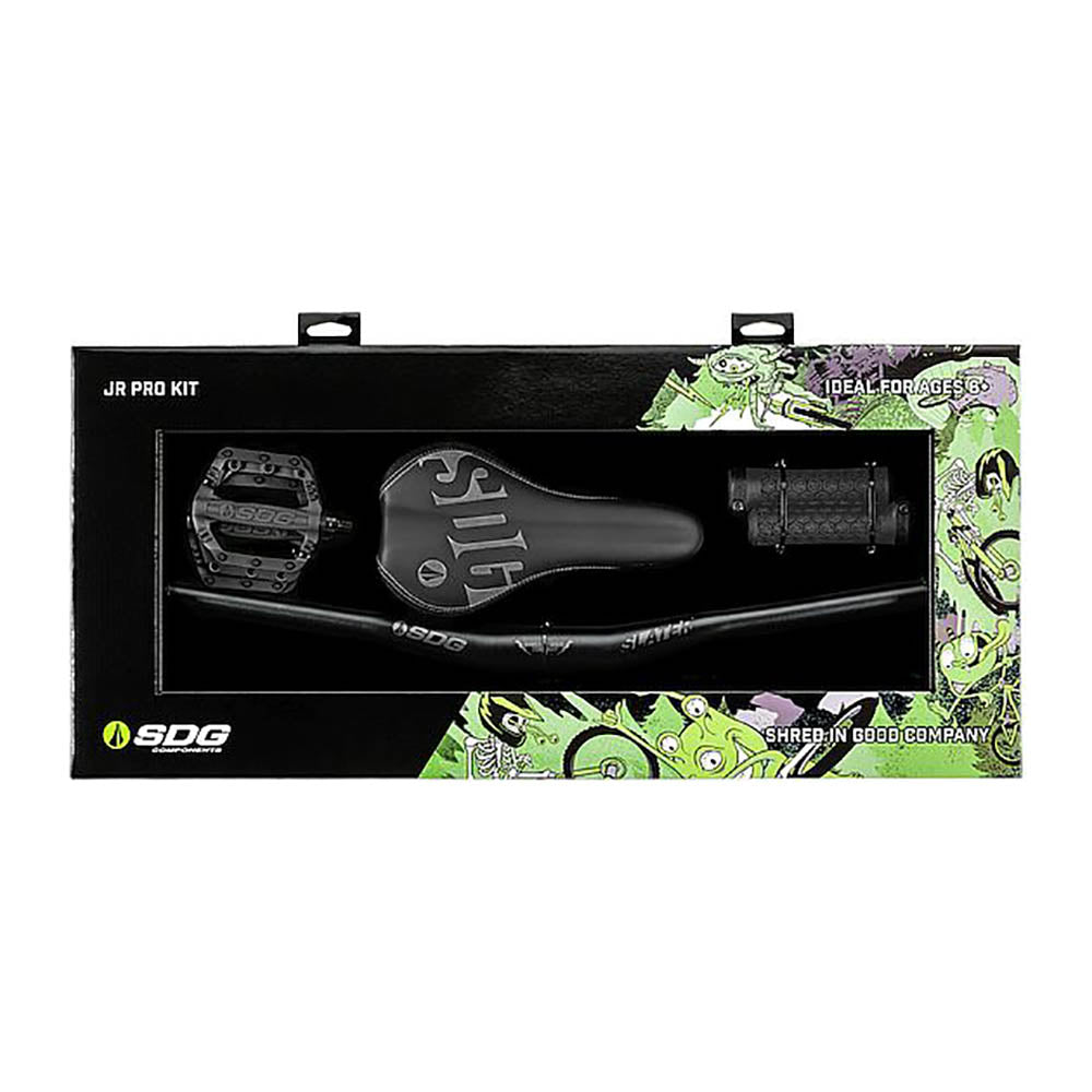 Sold as an all in one package, the JR Pro Kit includes a Slater handlebar with smaller 19mm diameter bar ends to fit the smaller 25-26mm diameter lock on grips that are included, Slater pedals with replaceable pins, and a Fly Jr. Saddle to cap things off.