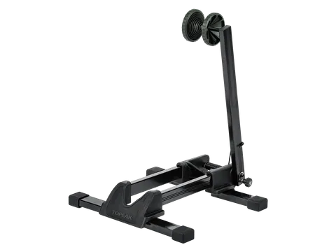 Durable, tubular folding stand for storing and displaying bicycles. A spring-loaded arm stabilizes the rear wheel and adjustable tire roller accepts 20mm road tires up to 3.25" wide mountain bike tires. Fits most road bikes, mountain bikes, or eBikes.